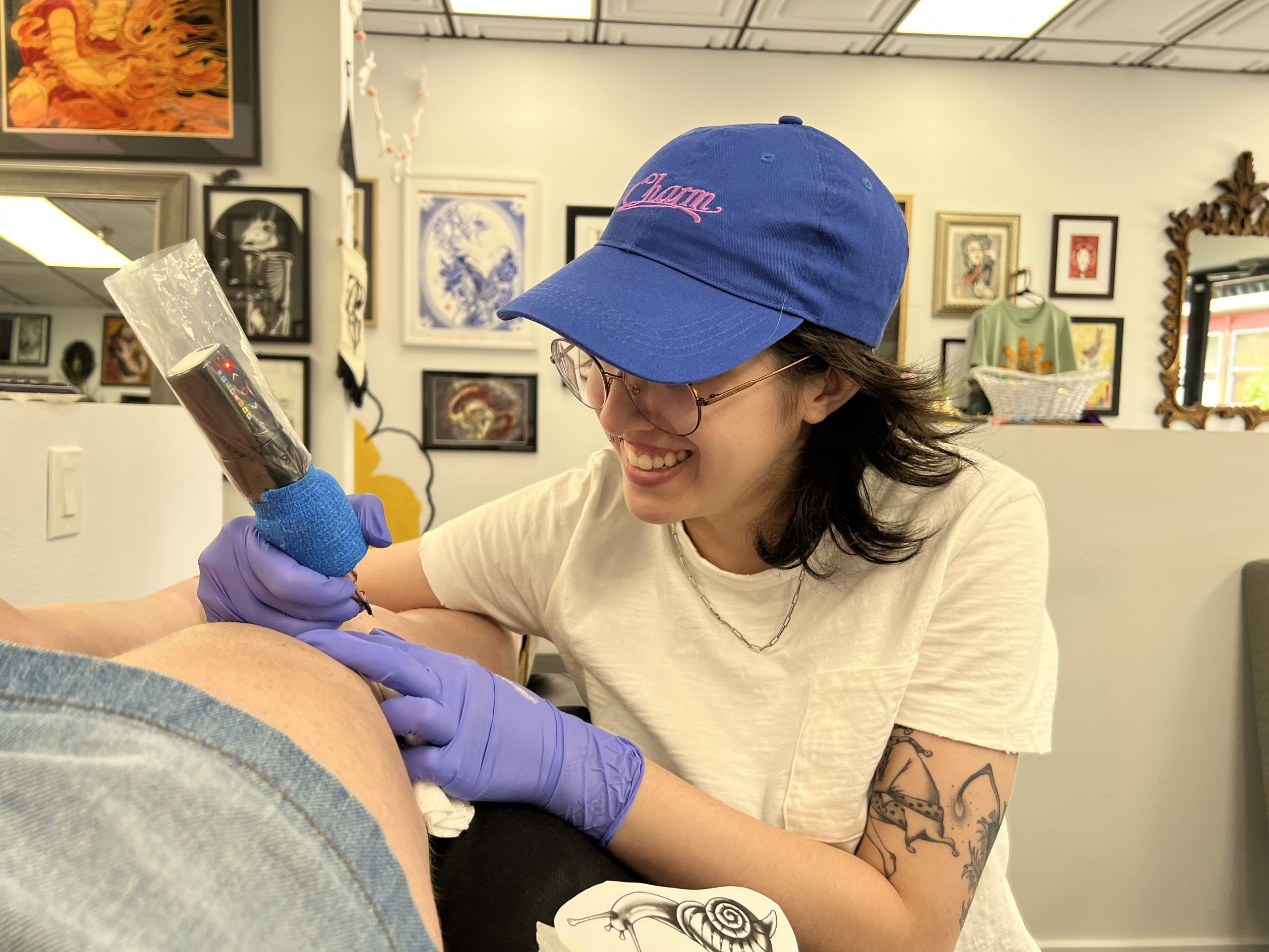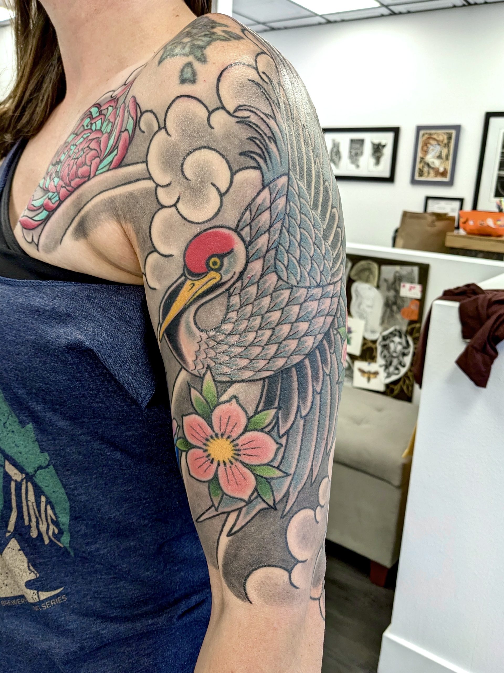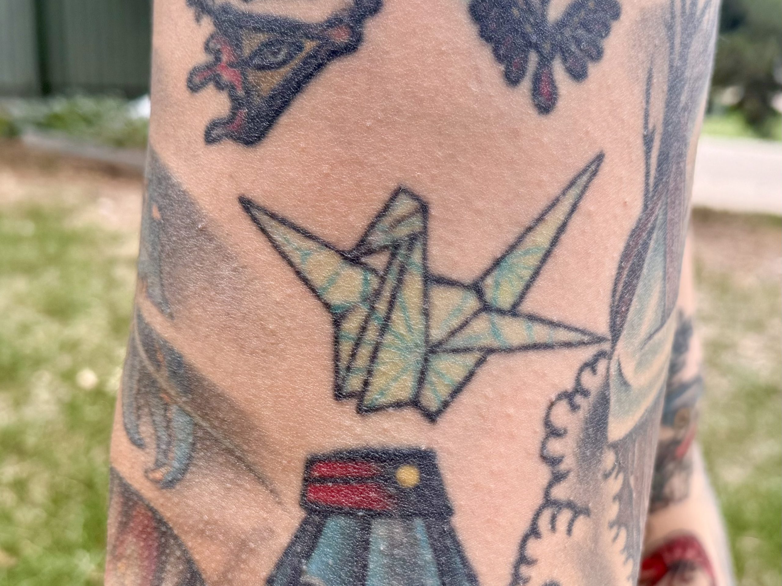 Over the years, Perkins says she’s probably done roughly 4,000 tattoos, even celebrating her 1,000th piece by tattooing the image of a paper crane on her own leg. Perkins’ books are technically always open, but she says it’s generally a six-month process between the initial inquiry and getting ink to skin.