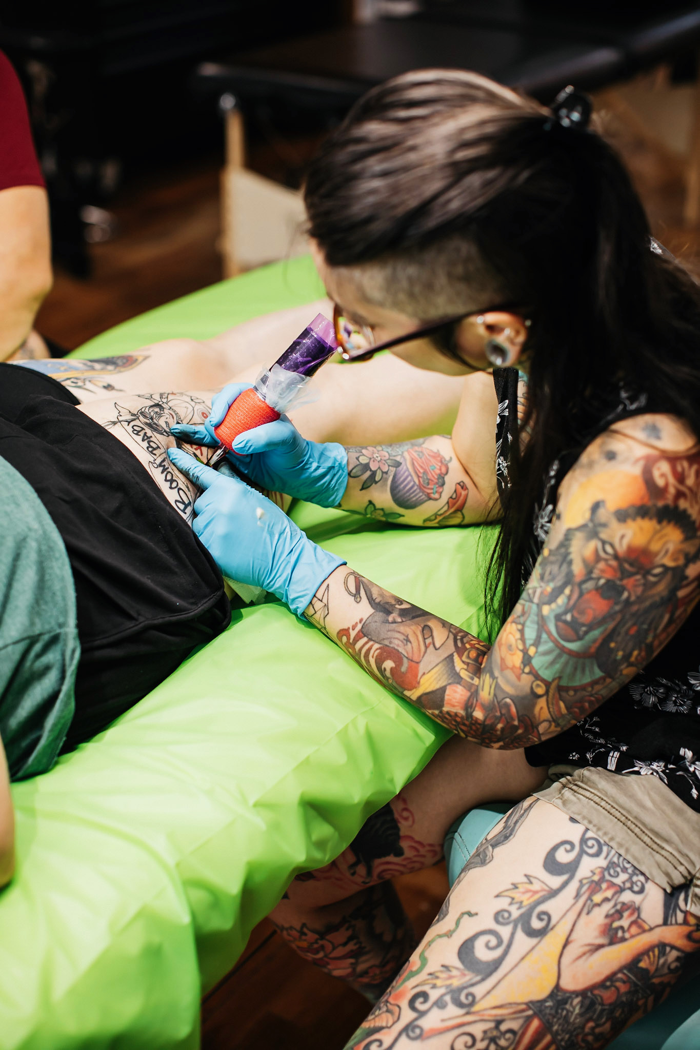 Tsunami’s first real mentor, Dave Allen, who now inks at Preying Mantis Tattoo, “was a champion,” Tsunami recalled. He acted as her North Star, illuminating her flight path towards higher altitudes, subsequently reinforcing her other long-held belief in inclusivity. She knew the power of diversity and its place in allowing for new perspectives and horizons to be explored.
