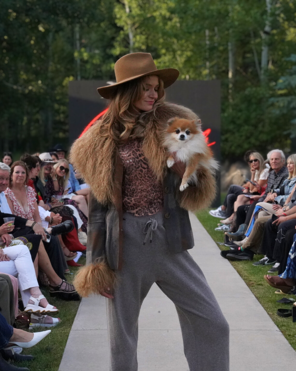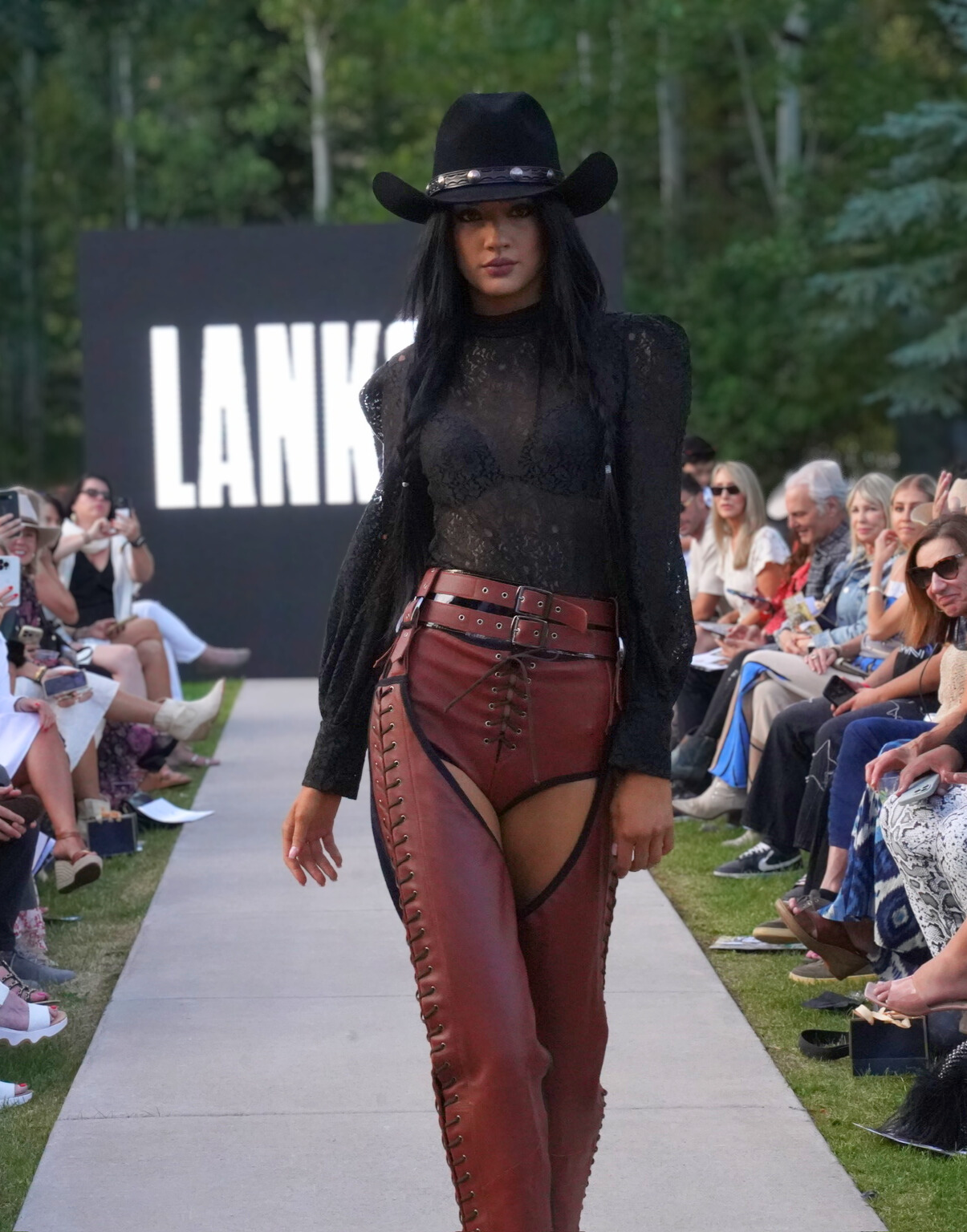 Together, the four designers demonstrated the versatility and traditions of Rocky Mountain aesthetic. Kemo Sabe opened with a tribute to Western history, featuring intricate fringed jackets, wide-brimmed hats and traditional Americana silhouettes, all with a modern twist. The runway got increasingly modern from there, with Bandana Aspen pairing contemporary prints with fur and animal prints (and, in two looks, furry friends on the runway). Blanco countered Bandana’s maximalist vibes with sleek, minimalist athletic looks for the modern man, and Lankova closed the show with a grungy twist: skin-baring chaps, colorful fur and chunky accessories.