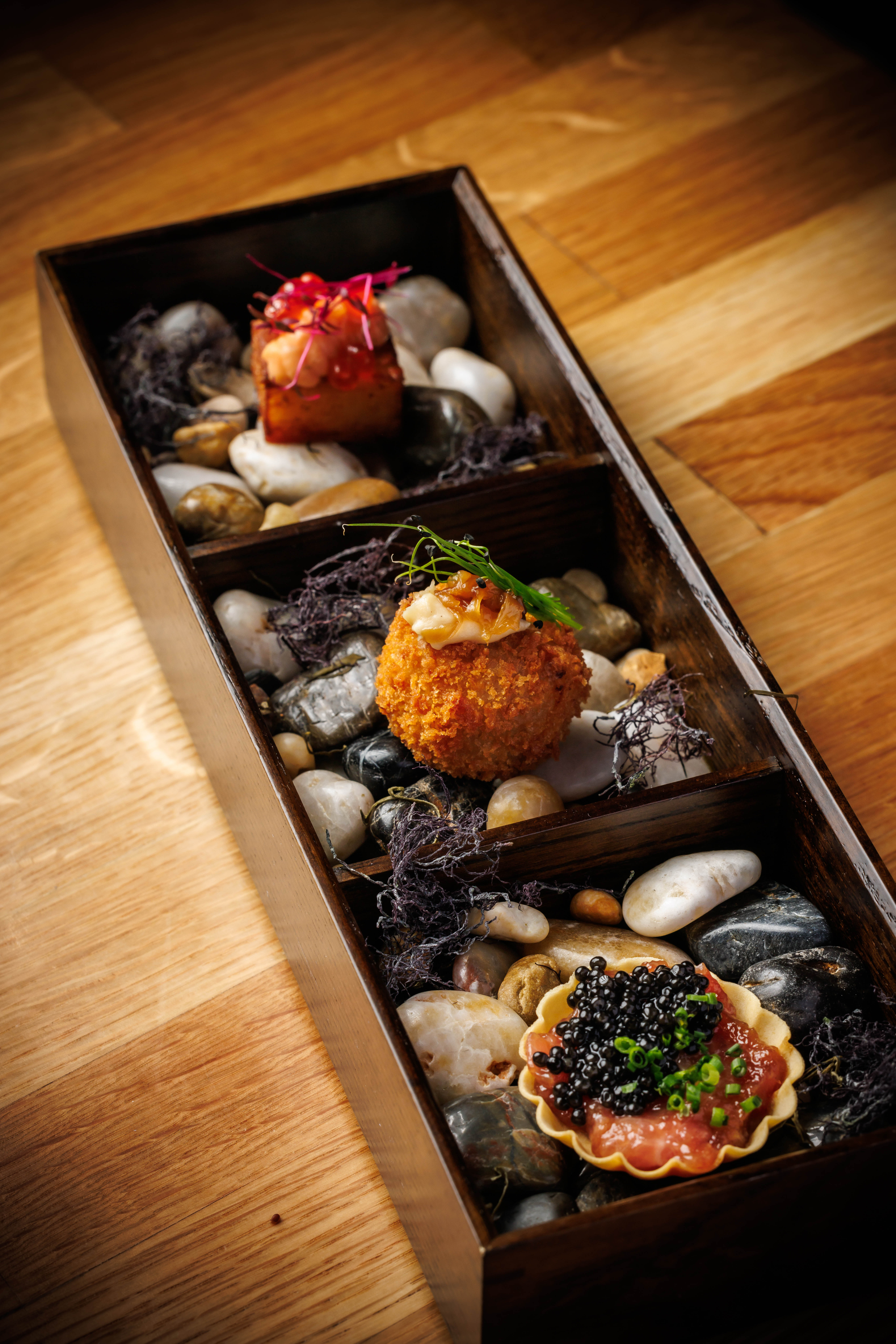 Then, another shift in Yōshoku’s rhythm. The second half of the experience will be enjoyed hot, celebrating robust flavors. A Crab-Curry Chuwonmushi is served sculpturally in an eggshell, held by a ceramic hand atop a bed of sooth, black pebbles. “Don’t eat the rocks,” implores Chef Paul, again reinforcing his dry quirkiness before returning to the plating if his next course. And that course may very well be the showstopper: Hokkaido Milk Bread with PEI Mussels bathed in a Tom Yum broth. Texturally, the milk bread holds up to the soup, while the sweet saltiness of the mussels adds even more dimensionality to the intoxicating Tom Yum. A Bento Box Zen Garden acts as the excalmatino point for this chapter of Yōshoku, eating from left to right Layered Potatoes with a Salmon Mousse, Caramelized Onion Aroncini and a Blufin Tuna Tartlette with White Sturgeon Caviar.