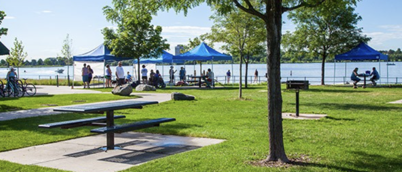 A popular choice for a waterside picnic, offering views of the mountains and downtown Denver, combined with a walking path.