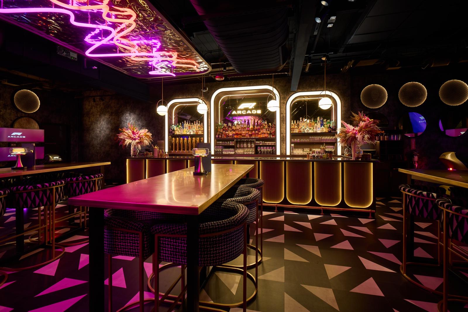 Inside, it’s stylized somewhere between the opulence of the 1920s Gatsby era, with warm, marquee-inspired lighting framing each wall, and the neon glow of a 1990s commercial mall, where sharp fluorescent lights cast across the ceiling. These bold and buzzy accents are illuminated by a dimmer overhead glow, unsupported by hardly a window, nodding to a Las Vegas casino. The disorienting space seems ideal for those who take their F1 racing seriously. It’s not hard to lose track of the outside world and become fully immersed in the screen.