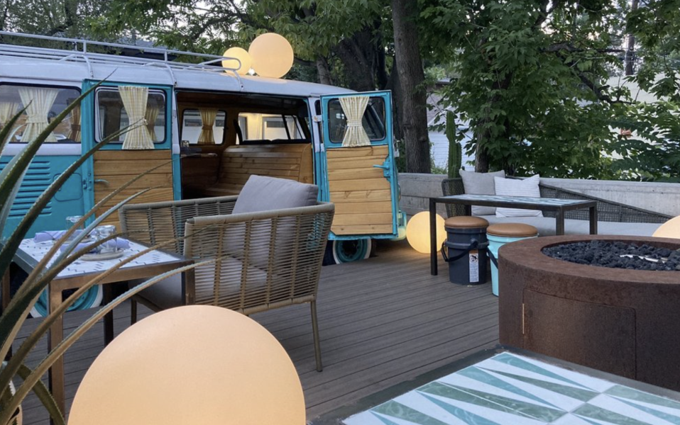 A portion of its front patio is converted into a communal greenhouse area, complete with four tables for enjoying drinks and charcuterie, offering an après-ski vibe.
